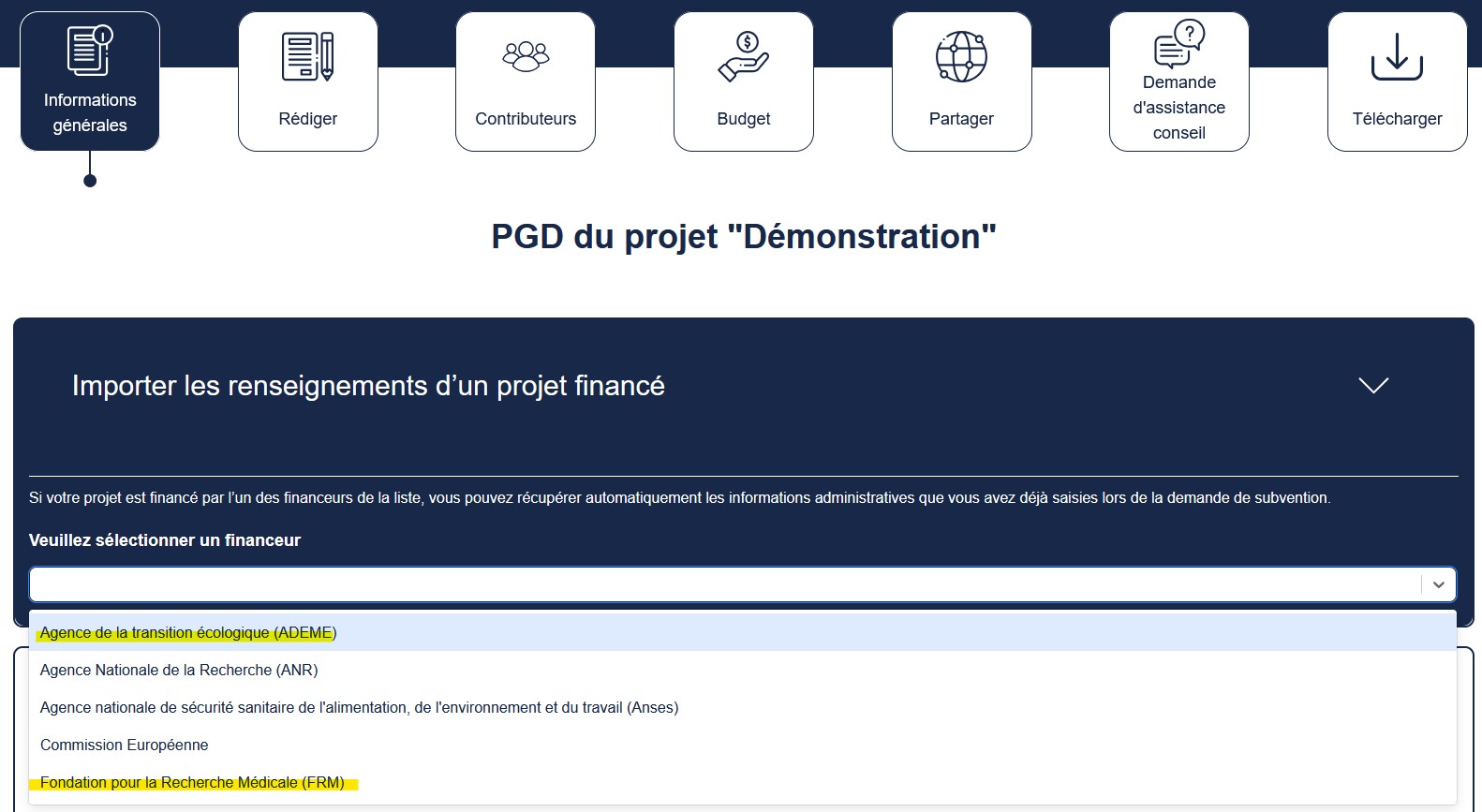 Dans DMP OPIDoR, un import automatique des informations administratives des projets financés par l’ADEME et par la FRM dans un PGD est maintenant possible, comme pour les projets financés par l’ANR, l’Anses ou pour les projets Horizon Europe de la Commission européenne.