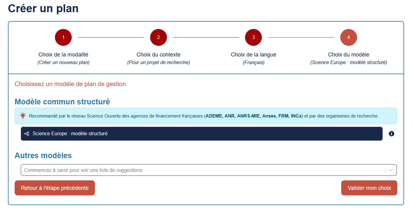 • Créer son plan de gestion de données en sélectionnant le modèle commun de DMP OPIDoR