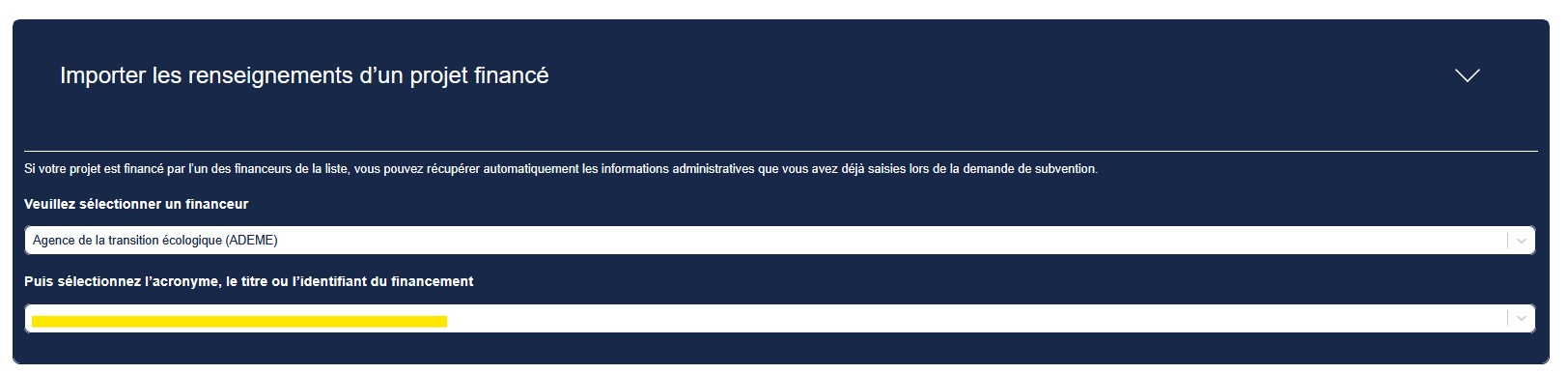 • Rechercher votre projet par l’acronyme, le titre ou l’identifiant du financement et le sélectionner